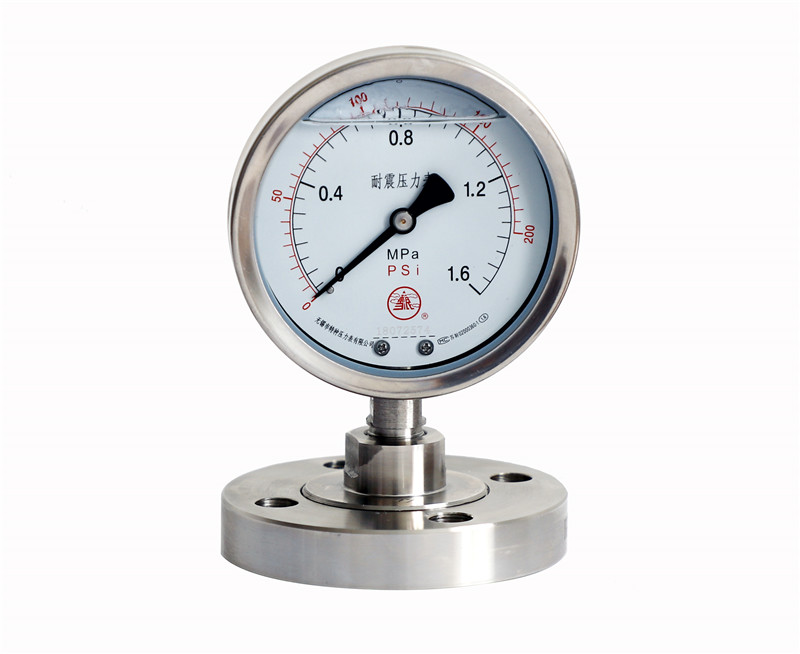 法蘭式隔膜壓力表采用間接測量結構,用隔離膜片將被測介質與敏感元件隔開,與設備采用法蘭連接,適用于測量強腐蝕、高溫、高粘度、易結晶、易凝固、有固體浮游物的介質壓力以及必須避免測量介質直接進入通用型壓力儀表和防止沉淀物積聚且要易清洗的場合。隔離器有多種材料,以適應各種不同腐蝕性介質。儀表適用于化學工業、化纖、合成纖維、石油、染化、制堿等工業,并有各種材質的隔離膜片及各種公稱通徑法蘭接口形式以供不同的工礦條件選用。